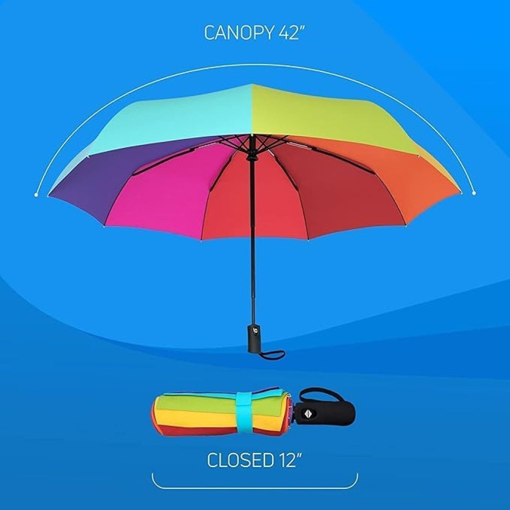 - Our umbrella comes with a wrist strap. Use the sturdy wrist strap on our foldable travel umbrella to provide extra security during heavy winds and rain, or simply to hang up when not in use.